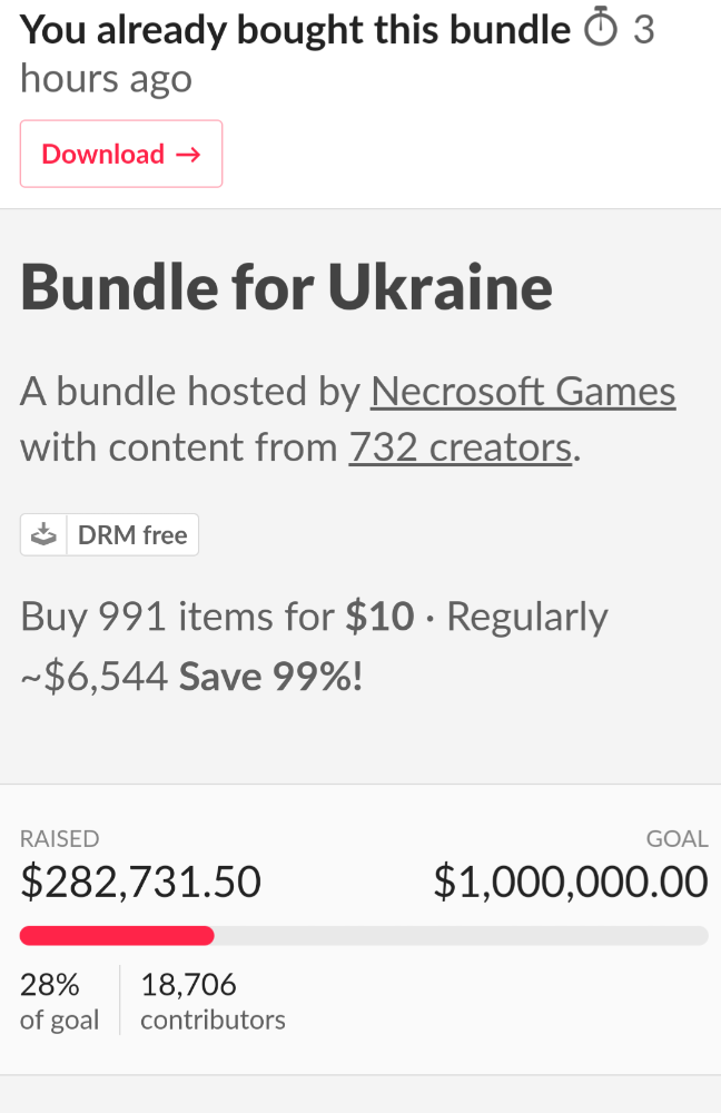 Itch.io Releases 'Bundle For Ukraine' To Raise $4 Million ... Itch.io is looking to raise $4 million to be donated to the International Medical Corps and the Ukrainian Voices of Children organization. As of this writing, over 151,000 bundles have been bought amounting to over $2.2 million in contributions from the gaming community. "The people of Ukraine are under attack.